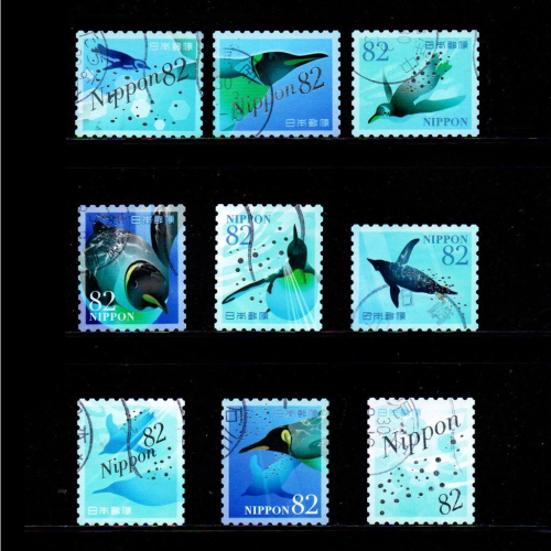 日本郵便局於2017年所推出的「海洋生物第1集」郵票,選擇了活潑可愛的企鵝打頭陣,主色採用清涼的水藍色和濃郁海藍色,搭配象徵水中氣泡的銀色點點,其中銀色部分皆為燙銀,非常有質感。
