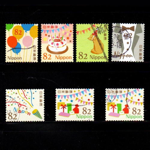 問候郵票是日本郵便局每年都會推出的郵票系列,這套郵票是2017年推出的「開心的問候」,以慶祝為主題,描繪了蛋糕、氣球、戴著派對帽的狗狗、拉炮與成堆的禮物,整體設計看著就讓人開心。值得注意的是下排最右邊的兩張郵票乍看是同款設計,但其實不一樣(提示:玄機在三角吊旗上!)