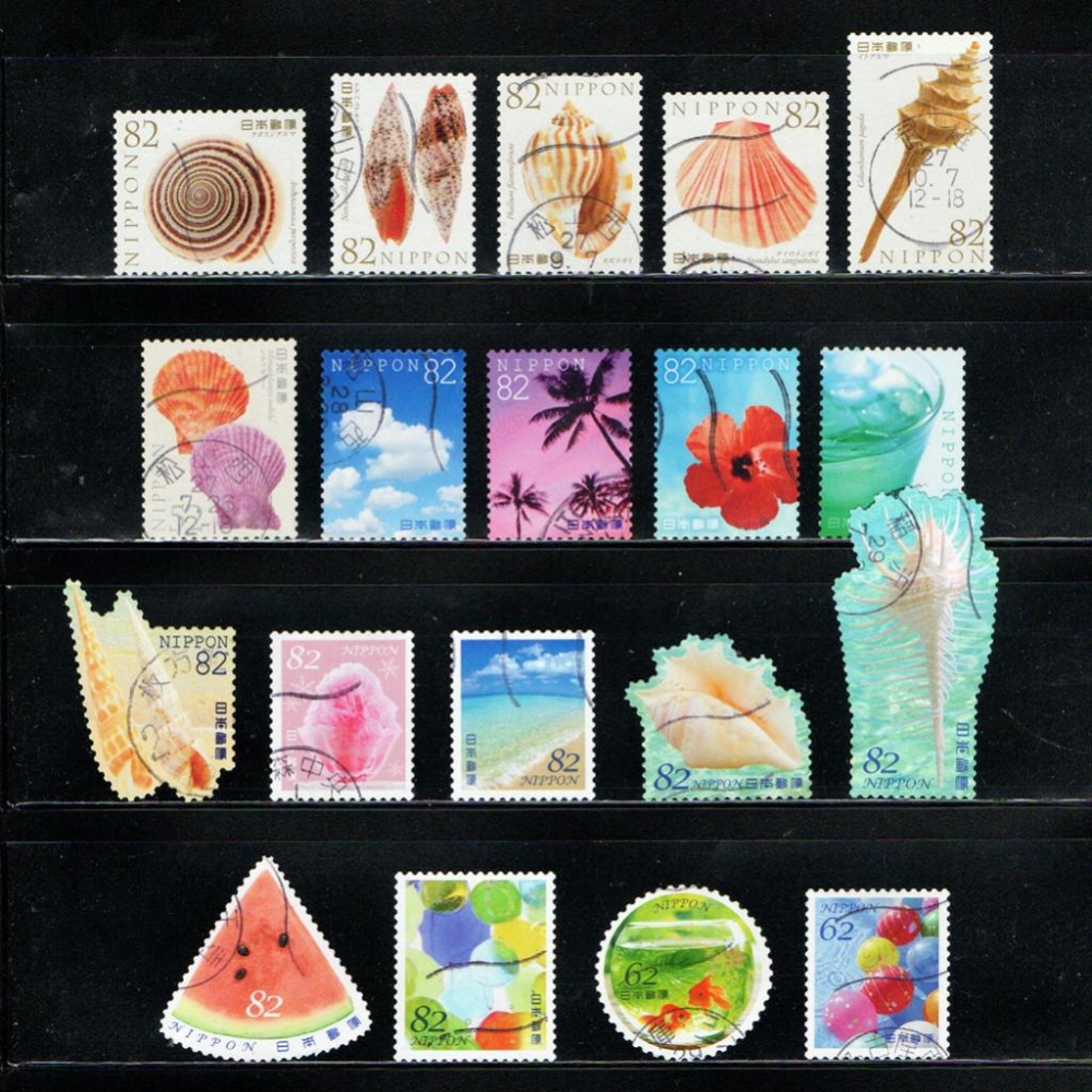 一組共19張,含三張較難入手的同系列52円、62円郵票。請留意掃描照僅供參考,實際出貨的郵票銷戳位置可能與照片不同喔!