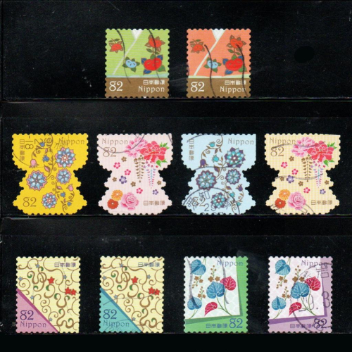 日本郵便局於2016年~2018年推出了4集「日本紋樣」郵票,此套是2017年所推出的第2集,以植物為主題,風格精緻可愛。掃描無法呈現真實顏色,圖中最上方2張和服造型郵票的棕色區域,實際為特殊的霧面古銅金屬色。