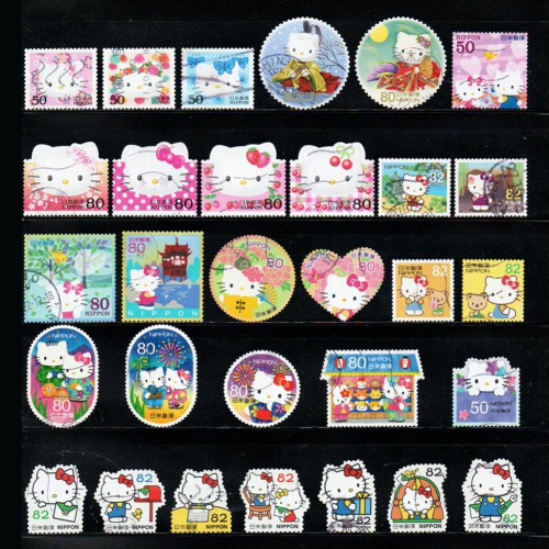 日本郵便局自2004年起陸續推出了多套Hello Kitty郵票,這組郵票包含了5張少見的50円低面額郵票,合計30枚一起賣。