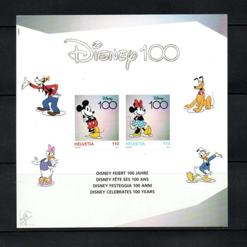瑞士於2023年11月發行迪士尼100週年紀念小全張,米奇與米妮皆是自黏式郵票,四邊還有高飛、黛絲、布魯托和唐老鴨貼紙作為裝飾〜首圖為掃描照,其餘三張皆以手機拍攝。