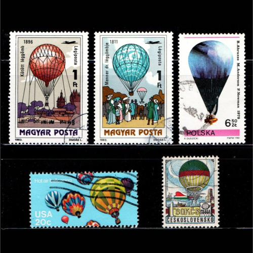 各國熱氣球郵票,共有匈牙利2枚、波蘭1枚、美國1枚、捷克斯洛伐克1枚,合計共5枚。