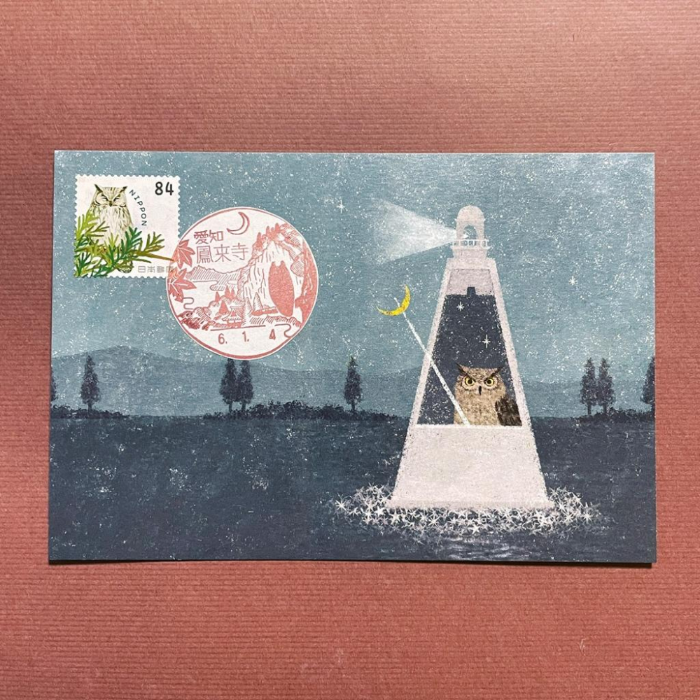 風景印圖樣:夜景、棲息在樹上的長尾林鴞、鳳來寺山。