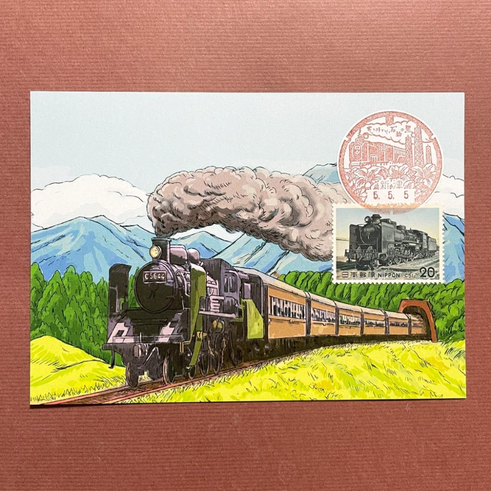 風景印圖樣:蒸汽火車、新津油田的油井塔、皋月杜鵑