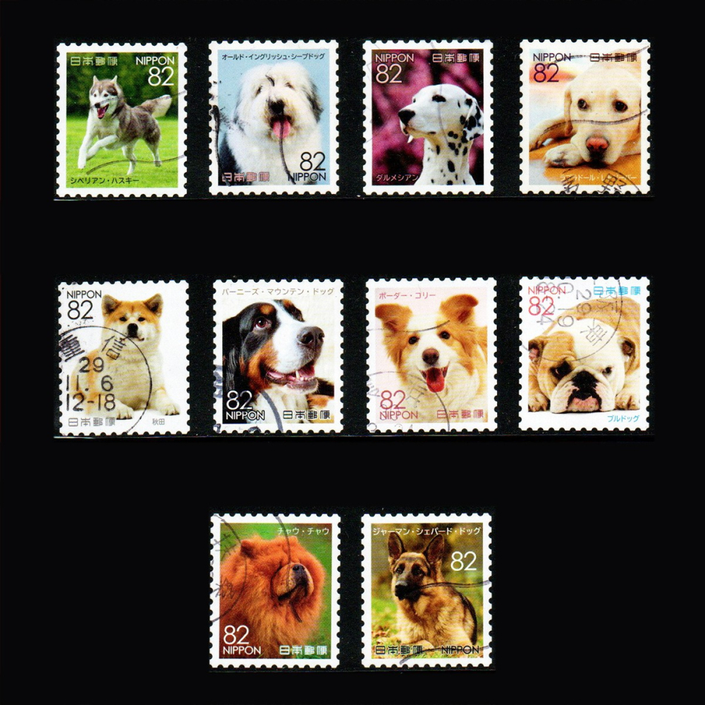 日本郵便局於2015~2018年發行了共5集「身邊的動物」郵票系列,以生活中常見的寵物為題材。這套是2017年所推出的第4集,以成犬為主題,用攝影的方式捕捉狗狗各種可愛的姿態🐶🐕