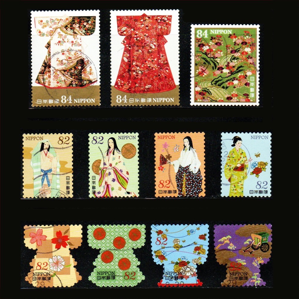 這組郵票綜合了2017年推出的「傳統文化的世界」與2021年的「日本的傳統文化第4集」兩套郵票,主題皆為和服,分別以插畫與攝影形式表現傳統和服的圖案、織紋之美。