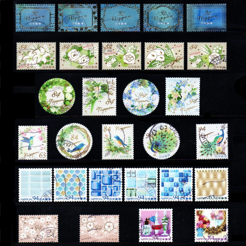 問候郵票是日本郵便局每年都會推出的郵票系列,這組「開心的問候」集合了2018年~2021年所發行的同系列郵票,共計29張,包含較少見的低面額與高面額郵票。
