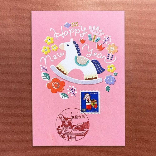 風景印圖樣:四池公園的浮見堂、荻花 (舊濱松市市花)、鄉土玩具「濱松張子」的裝飾馬偶