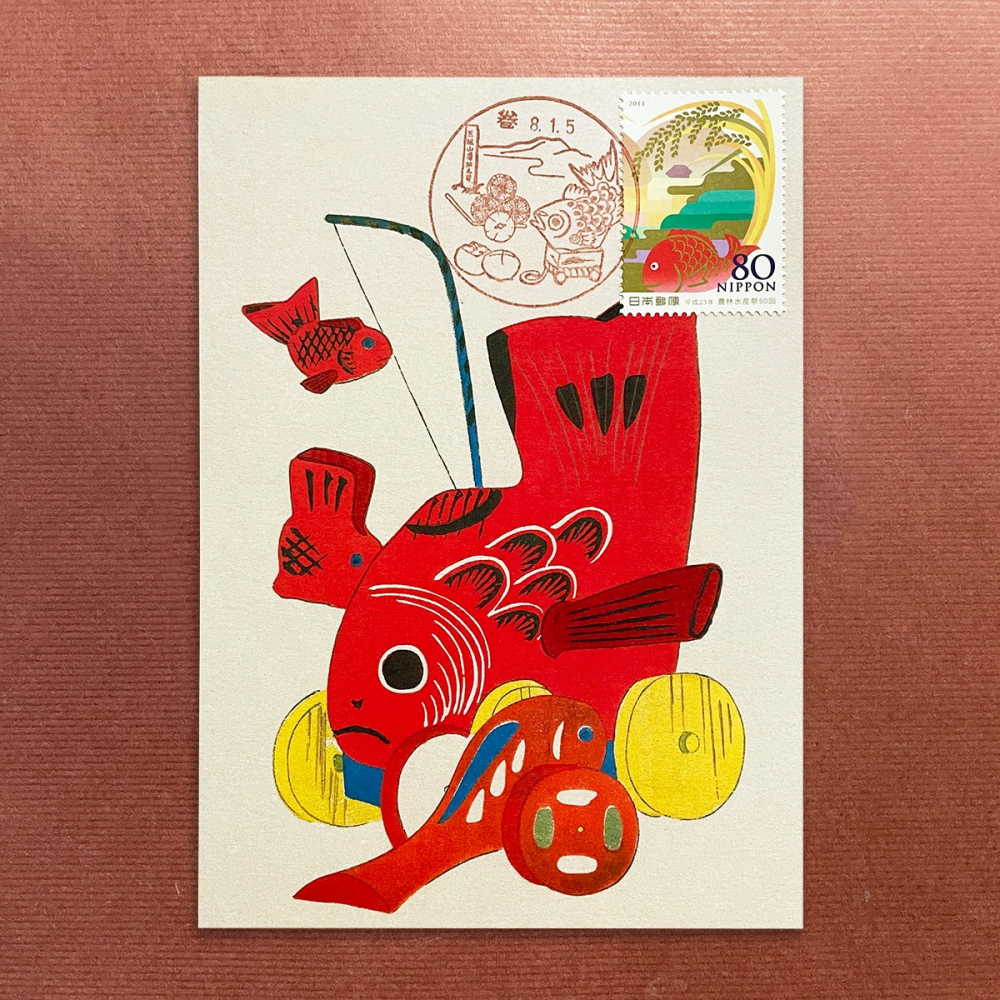 風景印圖樣:角田山、三根山藩遺址之碑、越王柿,鄉土玩具「鯛車」