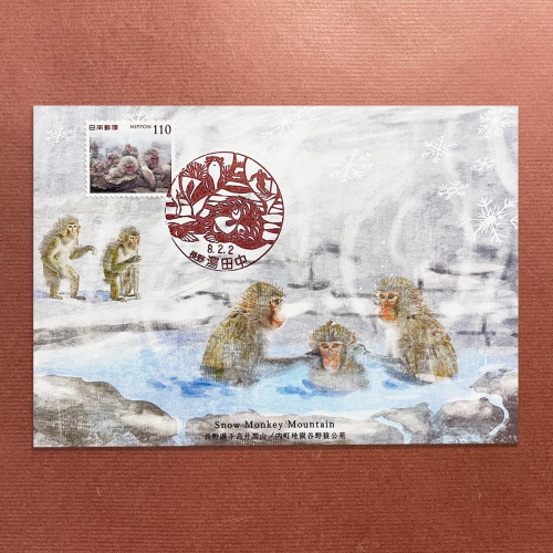 風景印圖樣:描繪地獄谷泡溫泉的猴子、縣指定天然紀念物的白鼬,以及滑雪者的圖案。