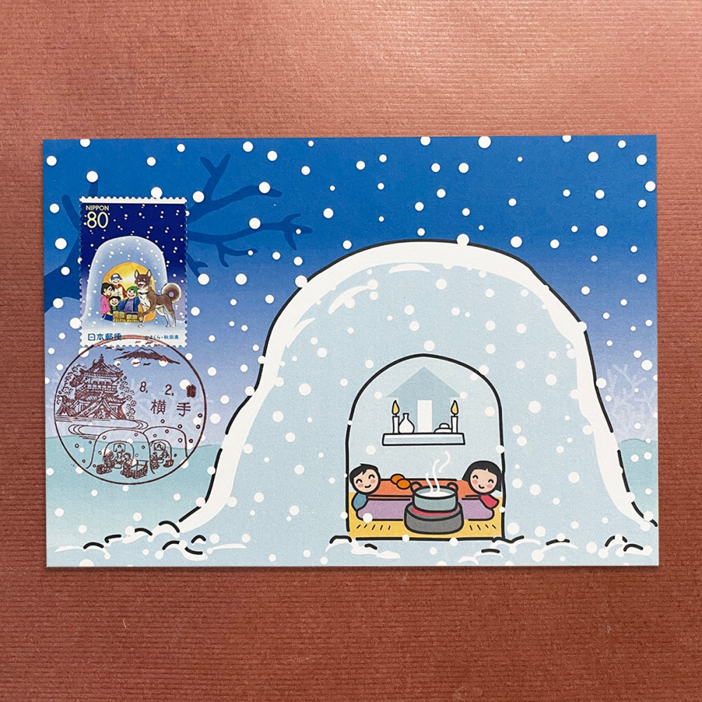 風景印圖樣:橫手雪屋祭、鳥海山、雁群、橫手公園的櫻花、橫手城的模擬天守。