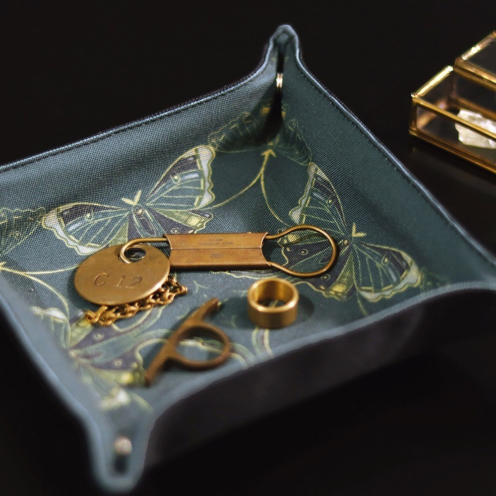 以青銅色勾勒出蛾的圖樣,設計排列如萬花筒般的驚喜,並以內斂的墨綠色襯托其華麗感。奇幻神秘又沉穩高雅的強烈風格,不管是增添居家氛圍的異國情調,還是用於混搭妝點商業空間,皆可運用。適合需要擺放鑰匙、零錢的玄關及櫃台,或是收納戒指耳環飾品配件的臥室,用於店內陳列商品更是百搭。