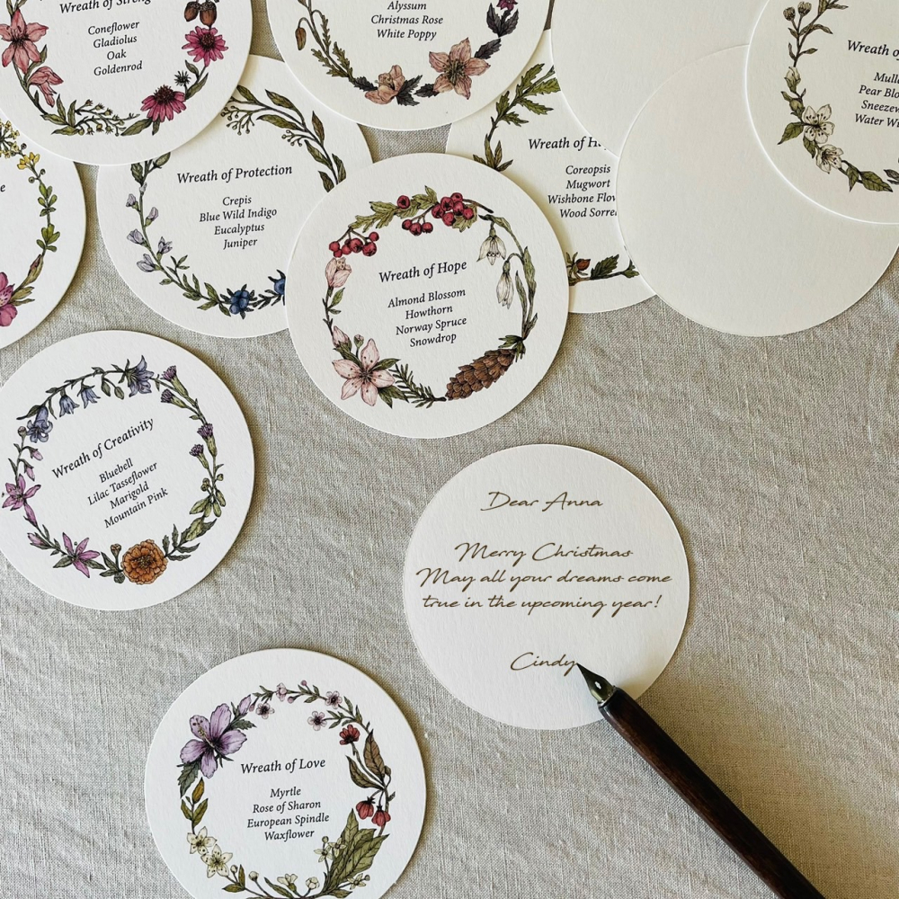 12款手繪花圈造型圓卡,每款皆由多種花草組成,附有名稱及代表寓意,例如:希望、喜悅、友情、健康等。透過花卉植物所賦予的象徵力量,帶給我們充滿祝福與備受眷顧的美好日子。