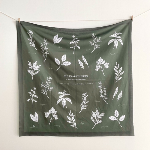 香草植物款式,附上英文名稱及象徵意義。可搭配各種日常使用情境;居家,可用作裝飾掛布及餐桌巾;料理,可充當臨時的工作頭巾或圍裙布;戶外,作為野餐巾及風呂敷包巾也非常適合。不論是哪一種情境,都能為生活增添植感氛圍。(隨商品附贈一張同款式圖樣明信片)