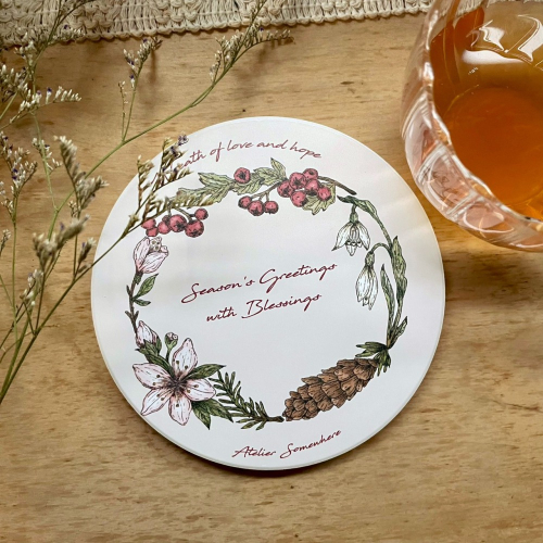 Season's Greetings with Blessings,手繪植物風格的祝福花圈陶瓷杯墊,充滿聖誕佳節氣息。百搭日常品飲情境。吸水及隔熱特性,是茶几餐桌上實用的小物。居家或工作空間的裝飾擺設亦適用,增添繽紛熱鬧的節日氛圍。