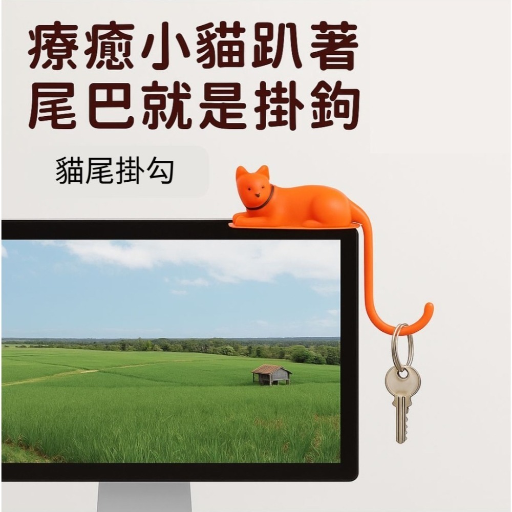 可愛造型:萌系小貓趴在螢幕上,尾巴自然垂下當掛勾