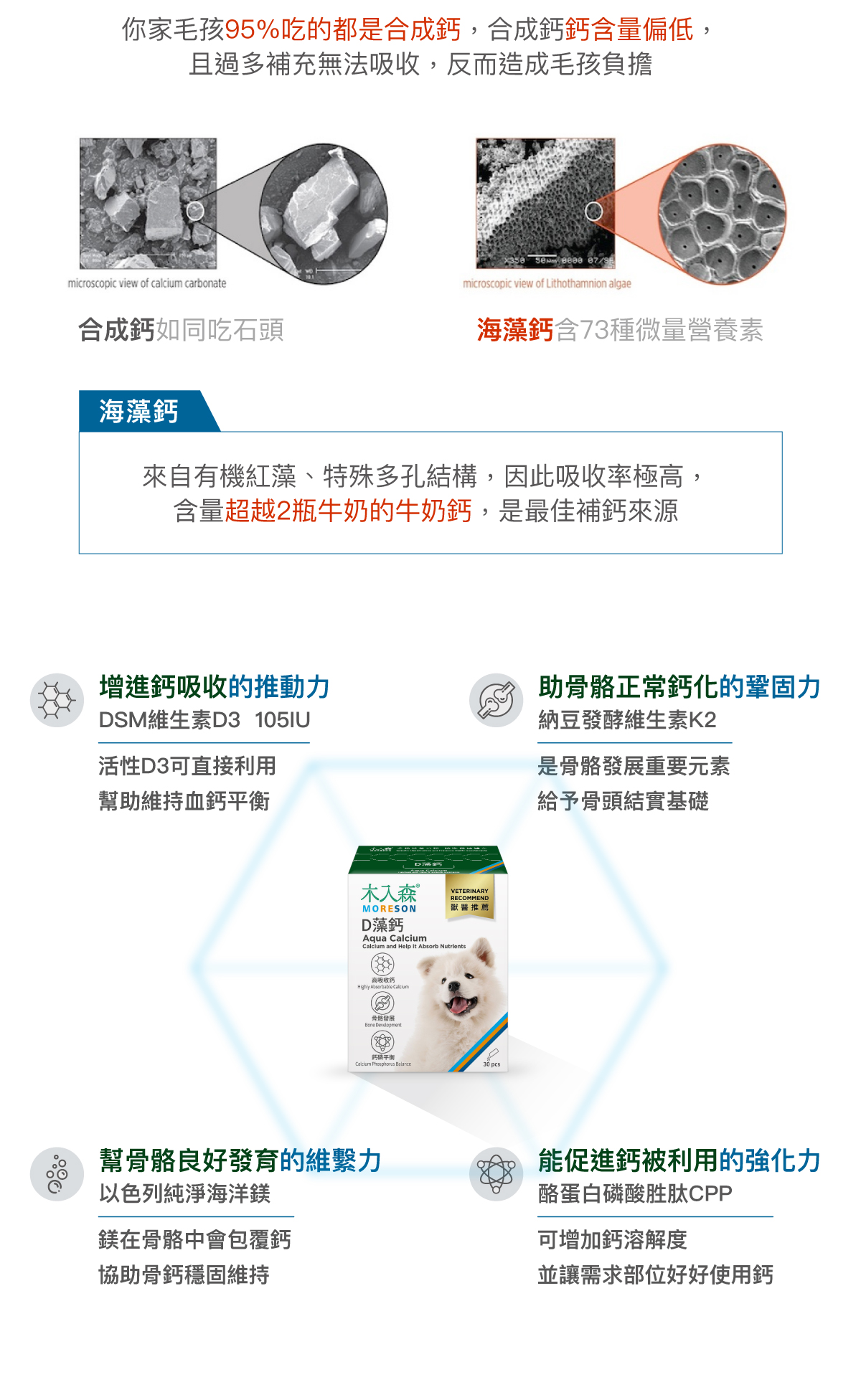 木入森《犬寶D藻鈣》選用 Aquamin F 愛爾蘭海藻鈣,足量每日強健需求 585mg,來自有機紅藻,特殊多孔結構,吸收率極高,含量超越 2 瓶牛奶的牛奶鈣,是最佳的補鈣來源。