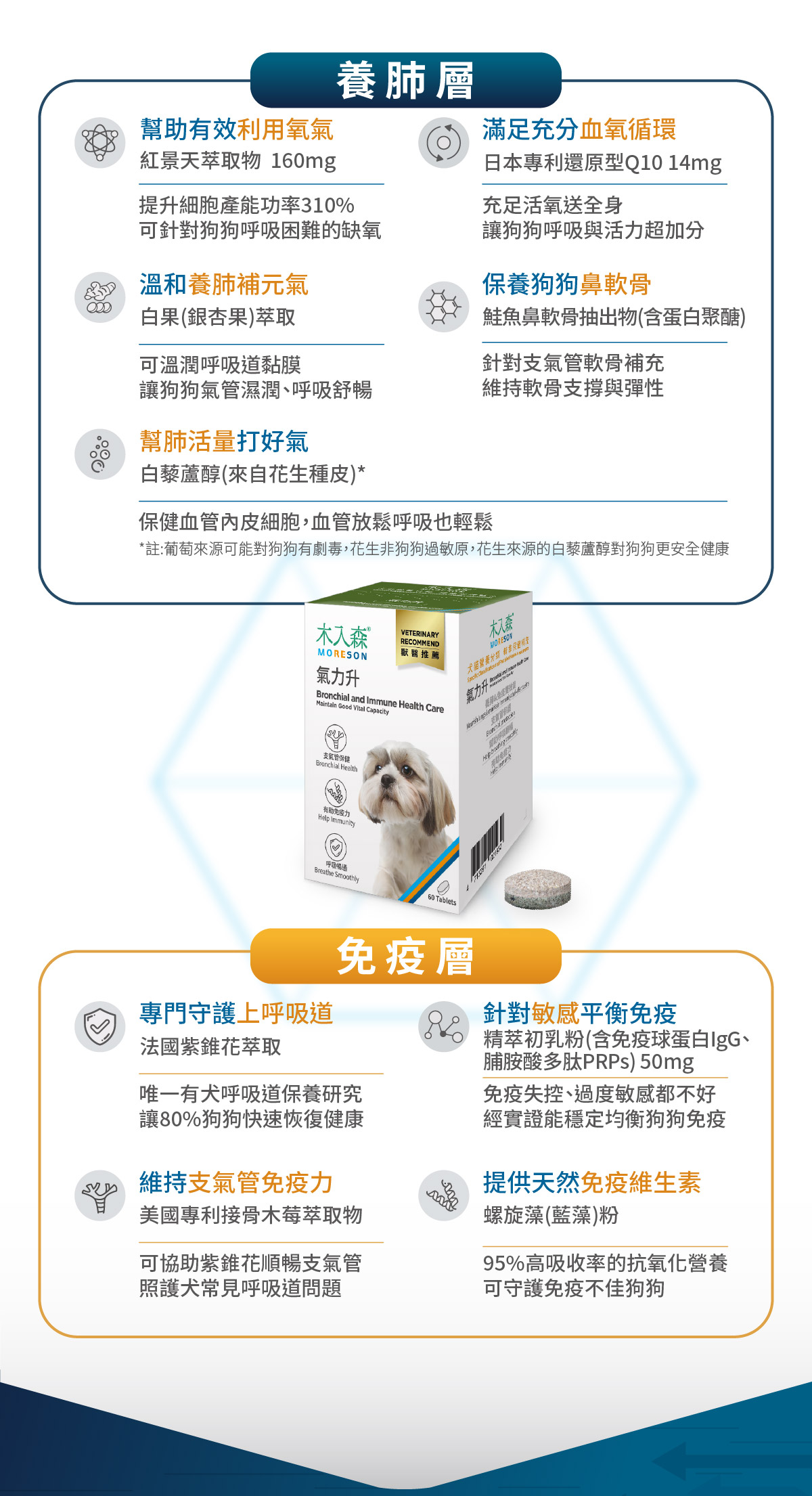 家中狗狗呼吸聲很大、常常氣喘嗎?木入森《犬寶氣力升》,一錠雙效,9 大配方呵護氣管與免疫力,養成良好肺活力。是適合「短鼻子狗狗」、「小型犬」、「肉肉毛孩」、「熟齡毛孩」的氣管保健食品。