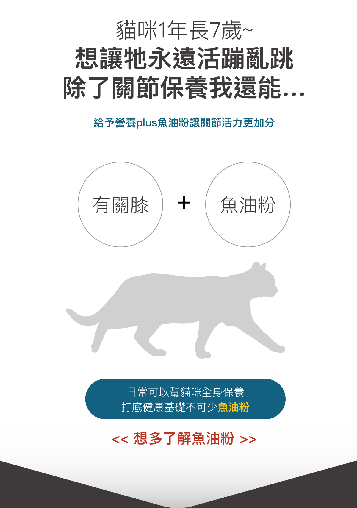 木入森貓咪有關膝,全方位關節保健配方,顧及軟骨重要 3 成分(膠原蛋白、玻尿酸、蛋白聚醣),可作為「好發貓咪」與「老年貓咪」的營養補充,以及「關節不適」貓咪的護理營養。即早關節保養,貓咪活力不減分。