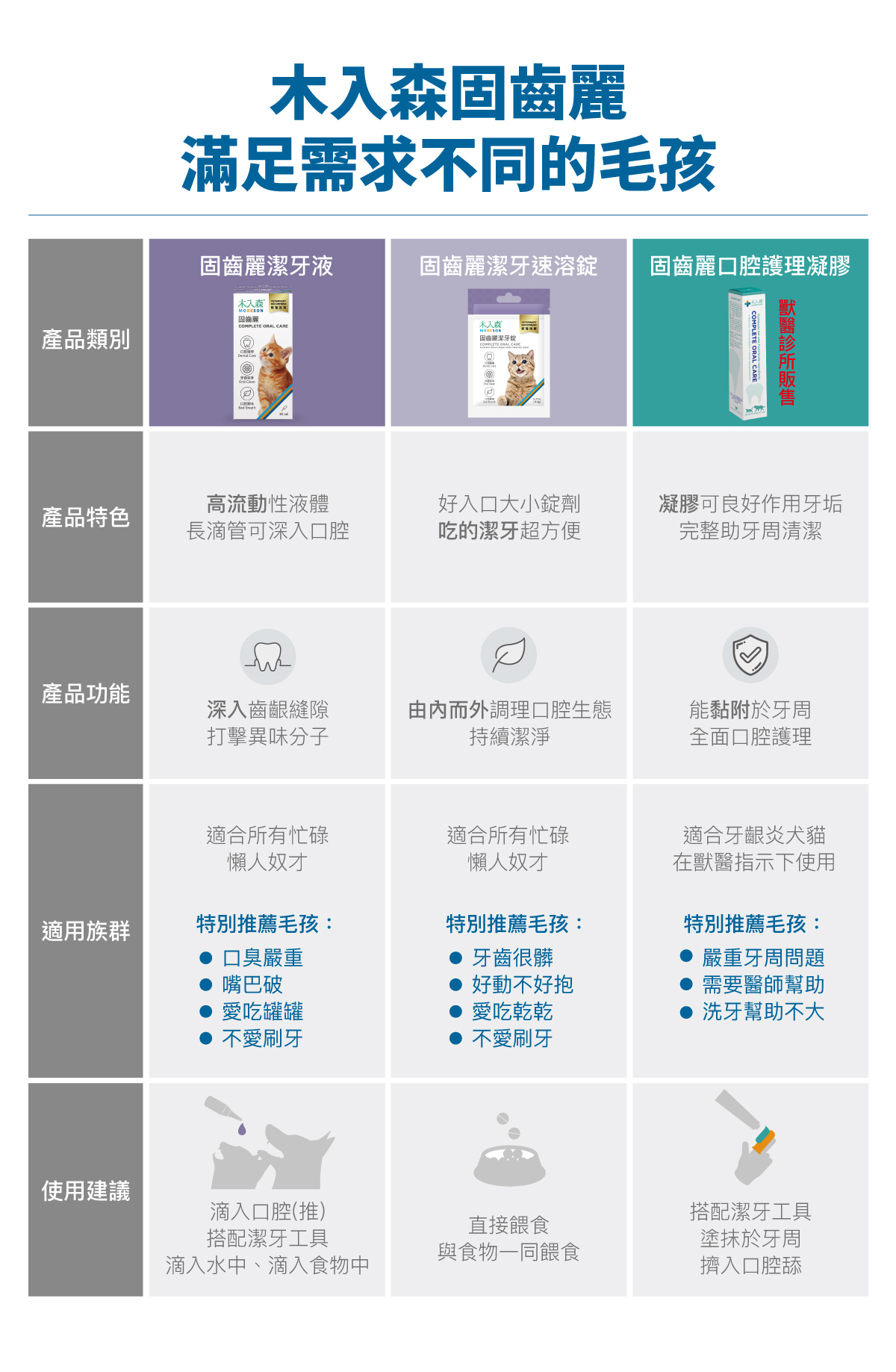木入森貓咪固齒麗,保健口腔牙齒,潔齒 5 大成份,口腔護理,幫助控制牙垢,消除口腔異味,維護牙齦健康,「不愛刷牙、有口臭、有齒垢、嘴巴破」的貓咪皆適合使用。