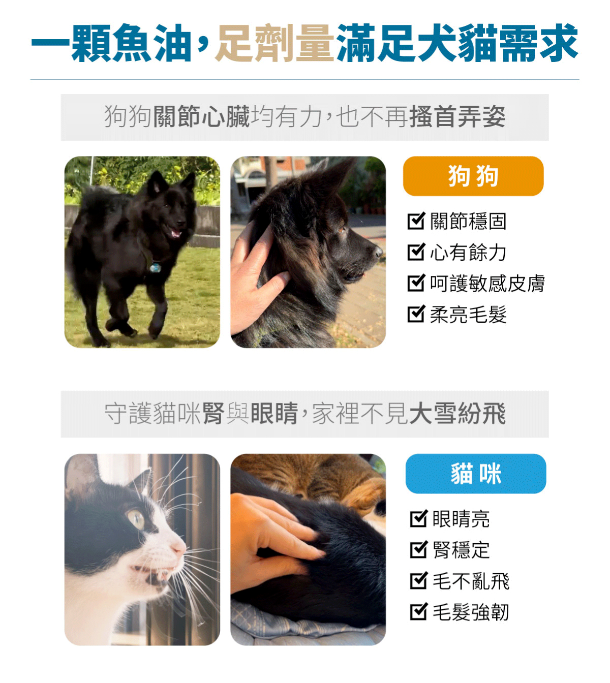 許多獸醫會建議毛孩 從小就開始補充魚油,每天一點點,替牠打好長期的健康基礎,不必等到出現問題才後悔。