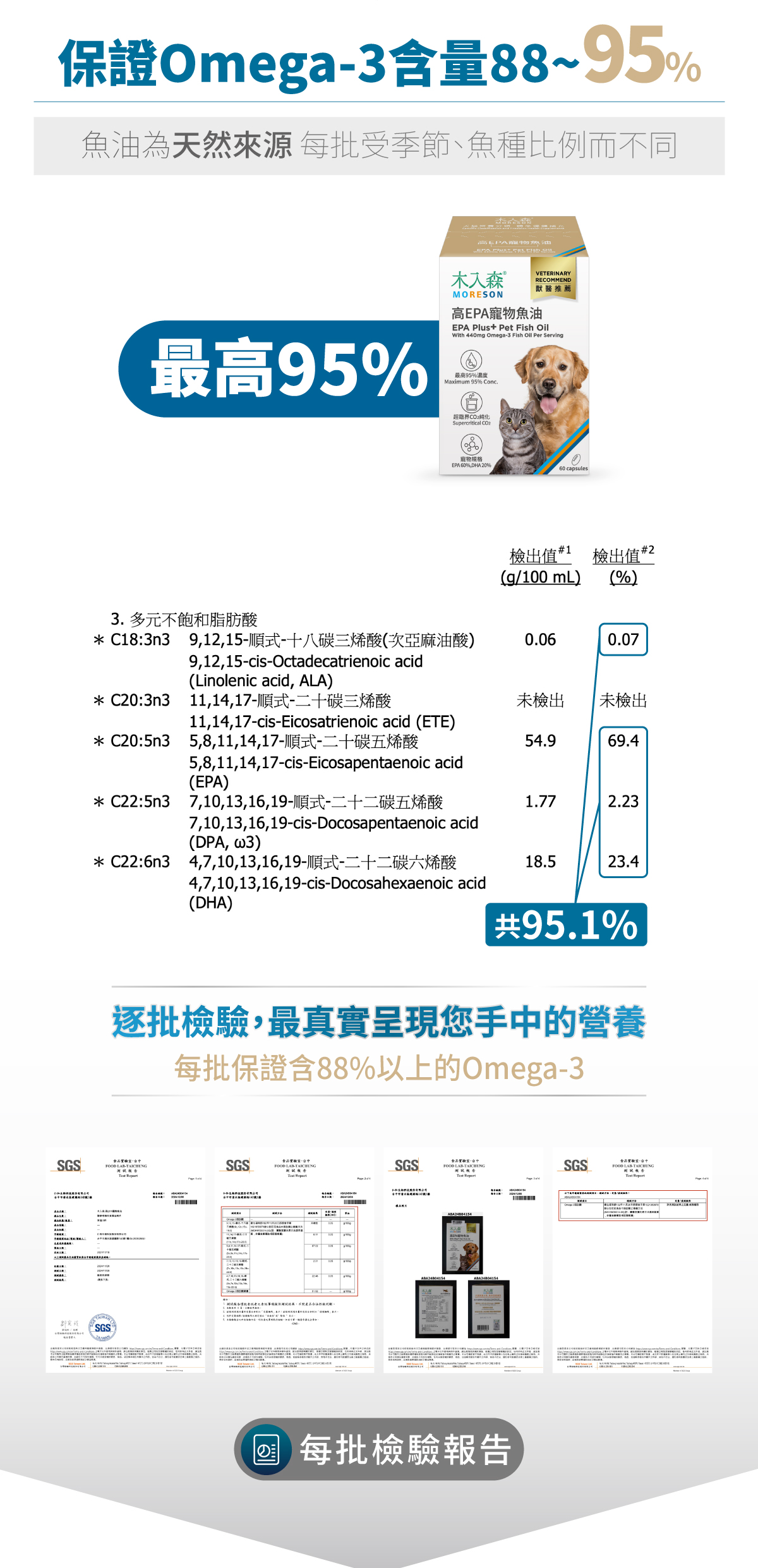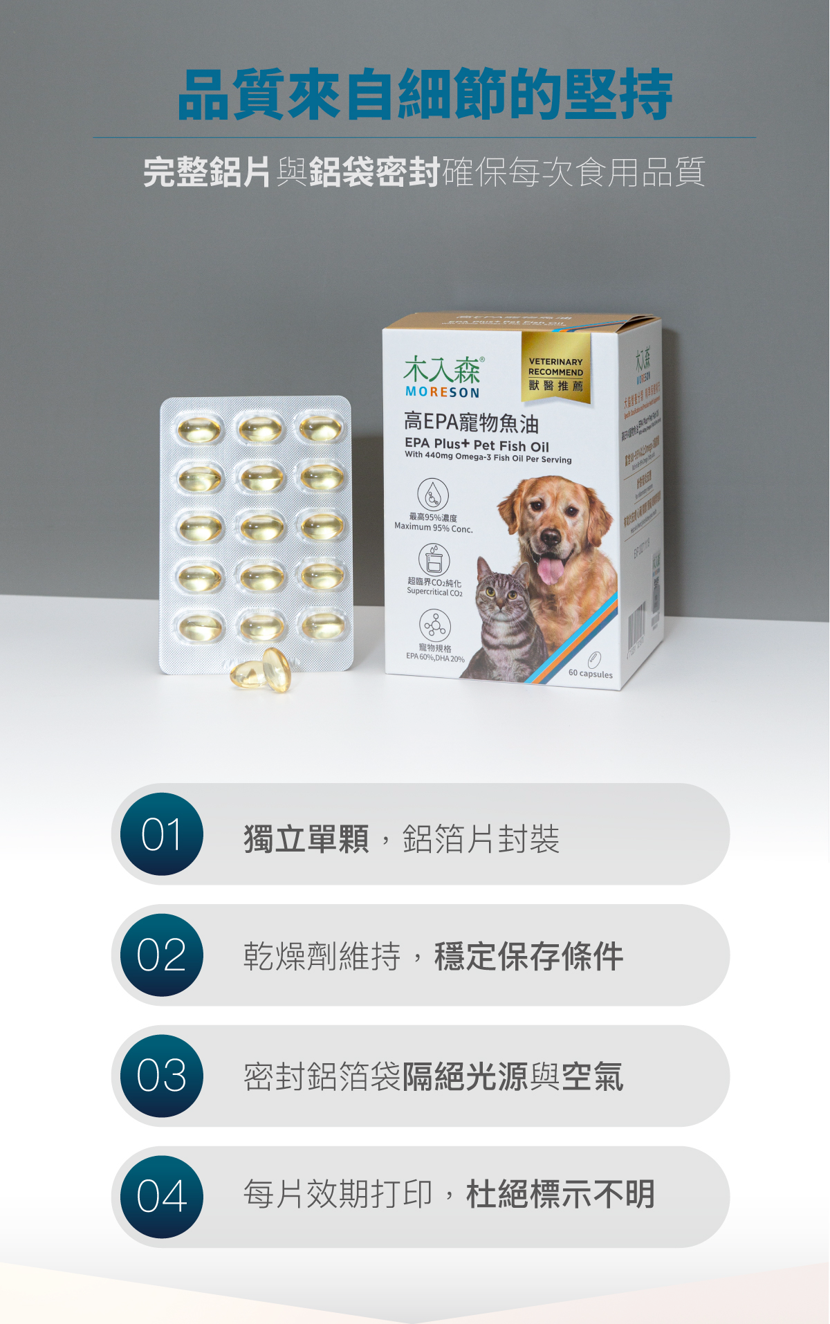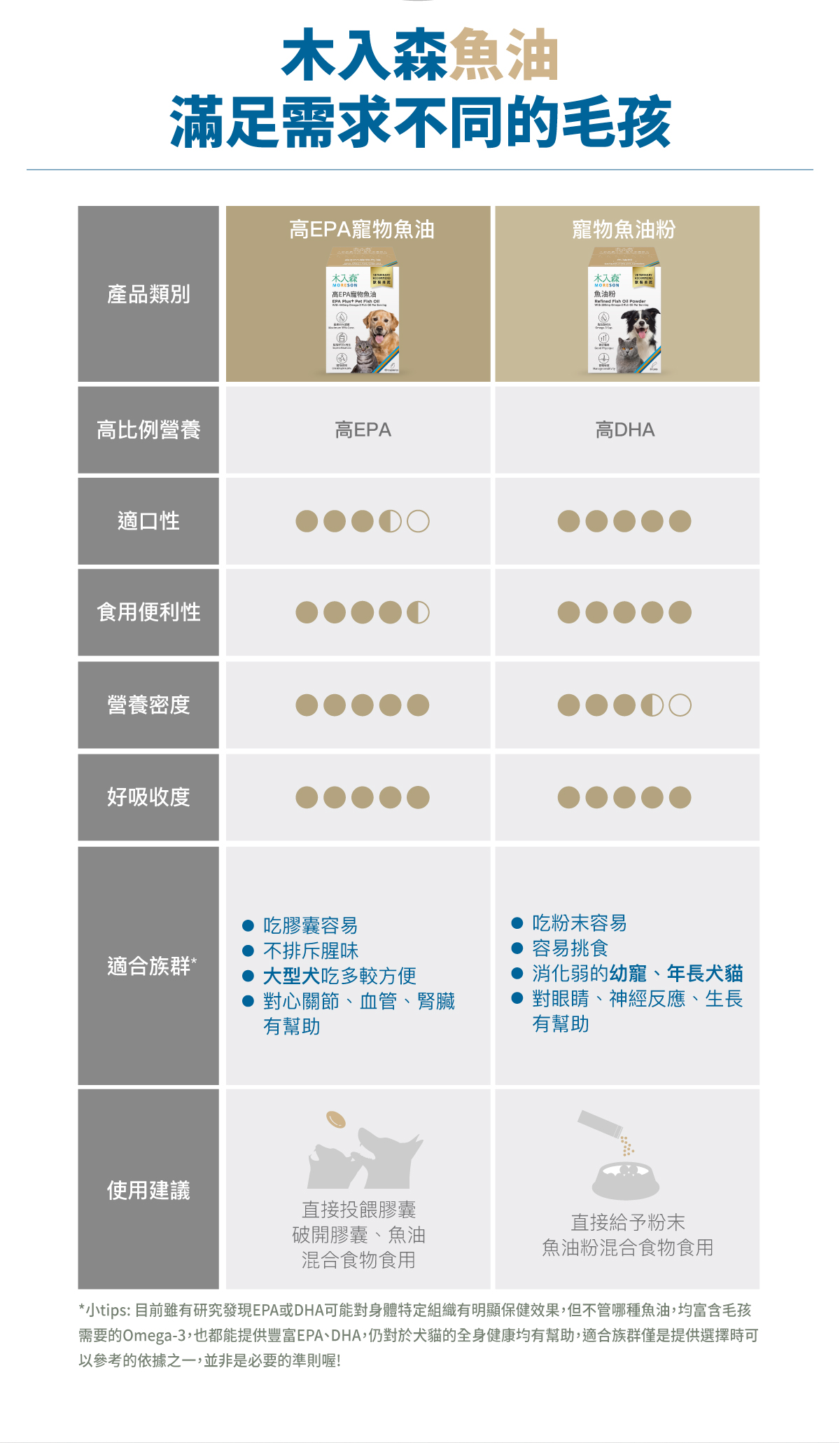 木入森高EPA寵物魚油採用 EPA 高達 60%、DHA 20%的黃金比例,專為犬貓健康設計,能更針對性地發揮作用: