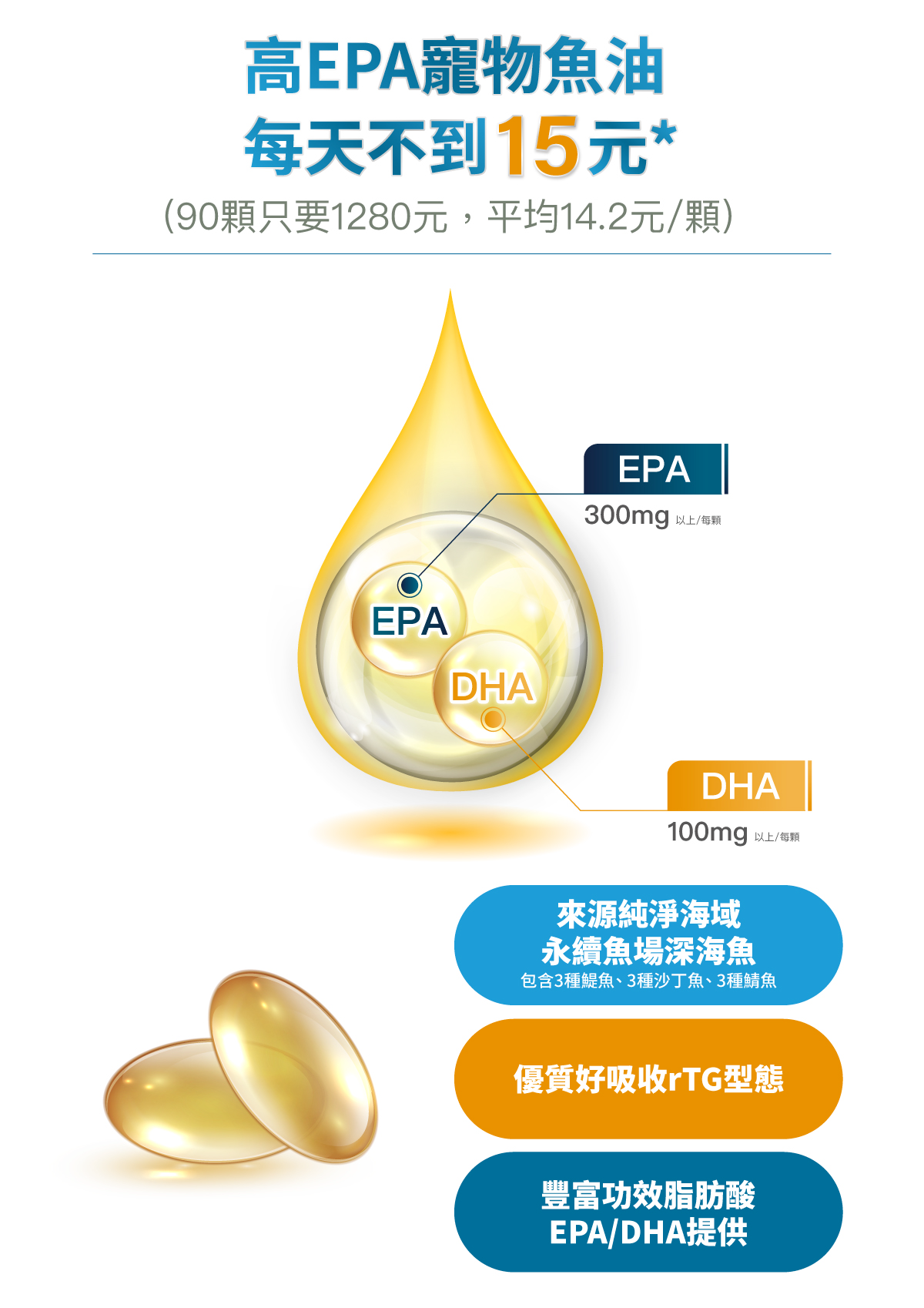 每粒膠囊含有總共 400mg 的 EPA 及 DHA,濃度越高,每次補充的有效成分就越多,讓毛孩的營養吸收更集中、效果更好。只要一粒,就能輕鬆補足所需 Omega-3,為牠們的健康打下紮實的基礎!