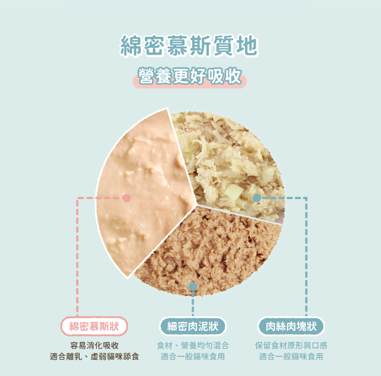 • 慕斯質地,更好進食與消化吸收