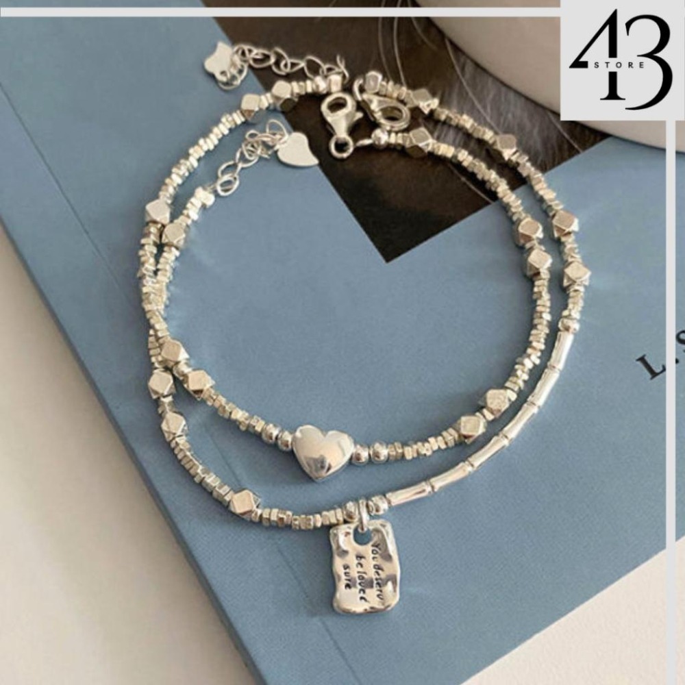 925鍍銀 鍍白金 愛心 方牌 碎銀 手鍊