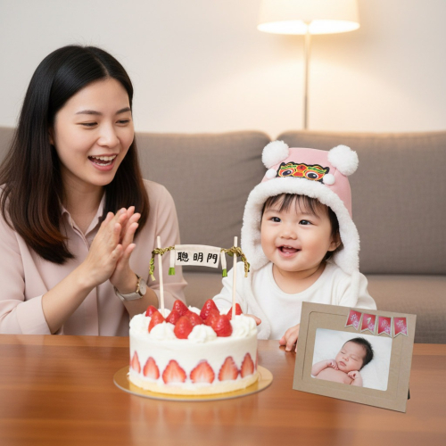 這款專為抓周儀式設計的**「聰明門」蛋糕小旗**,將傳統祝福與現代美學完美結合。