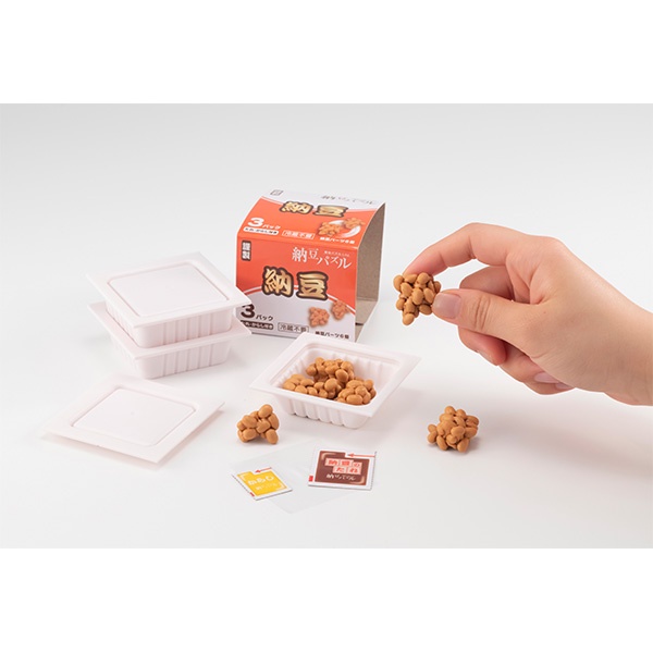 完整還原包裝細節:不只納豆粒,連透明膜、たれ(醬料)シート、からし(黃芥末)シート以及外層的**スリーブ(包裝帶)**等配件都完整附上 。完成後是一個逼真的納豆「3パック(三入裝)」 。