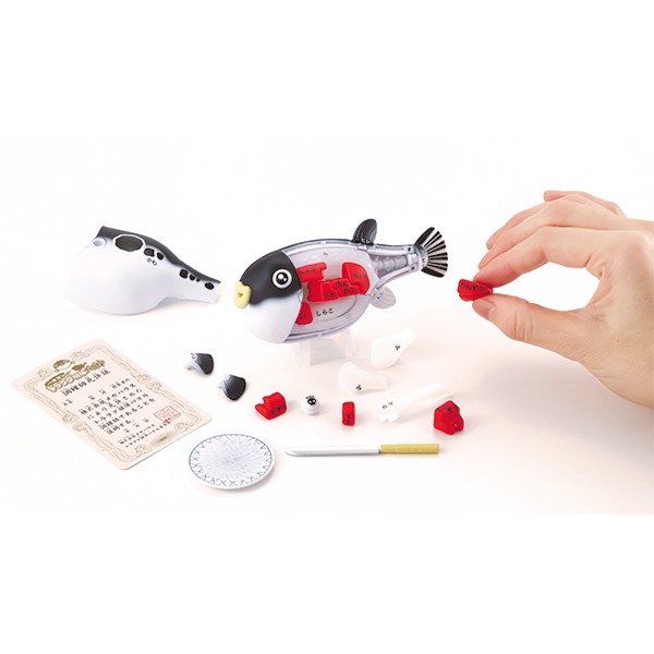趣味配件: 內含玩具包丁(菜刀)零件和專用台座 ,讓您體驗「切魚」的樂趣,並可以將組裝完成的河豚擺設展示 。