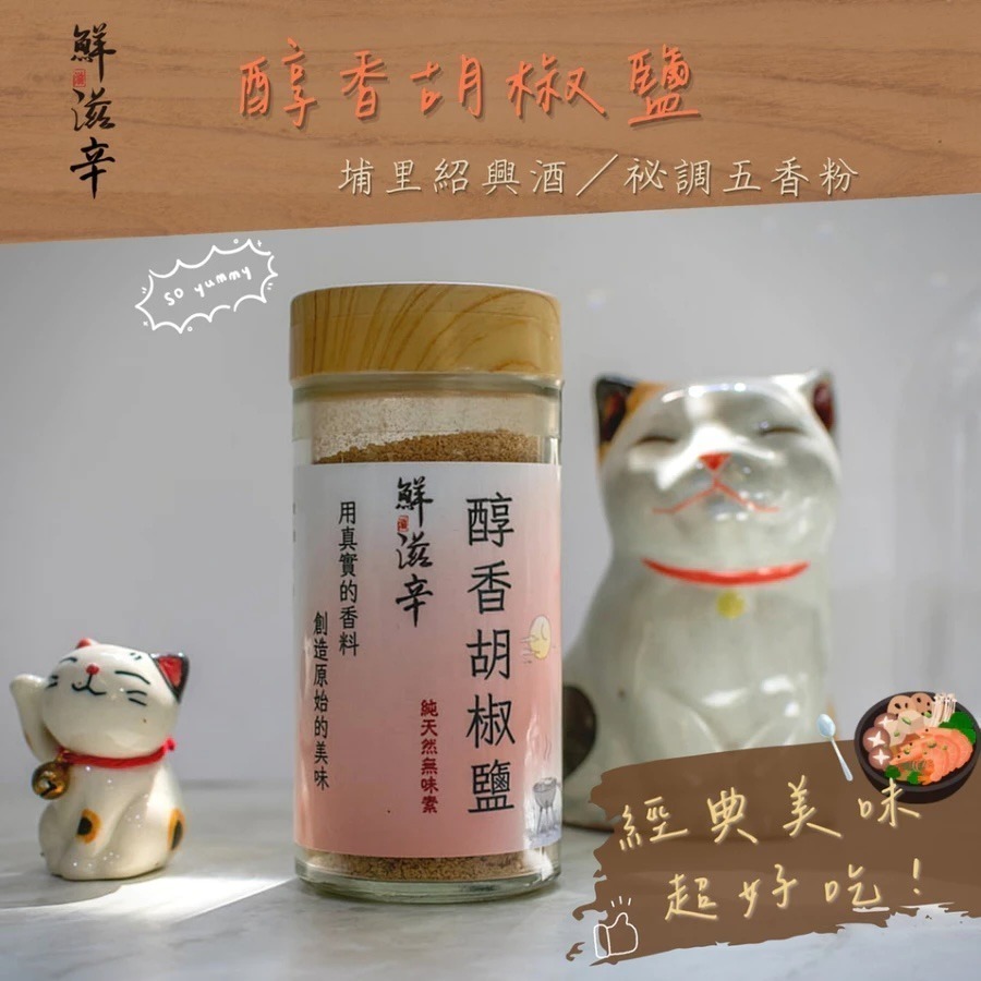 獨家調配祕製純正天然五香白胡椒粉,配上南投埔里名產玉泉紹興酒製作而成的酒香鹽。入口香醇無酒味。香辣吮指復刻出古早經典美味又更勝一籌,適用於各種料理添加品嚐。