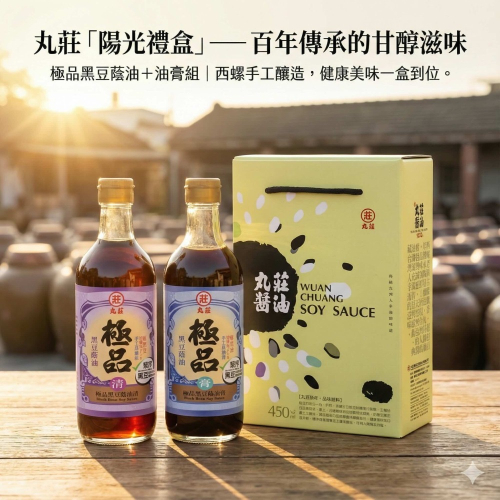 丸莊極品黑豆蔭油清以及丸莊極品黑豆蔭油膏採嚴選黑豆原料,依循古法純釀之「甘甜口味」蔭油。運用食品科技研發最新減鹽配方,提高黑豆蛋白質分解,生產高營養價值之健康醬油。甘甜風味的特級極品蔭油,風雅甘醇,清麗極致,滿足現代人追求品味的心