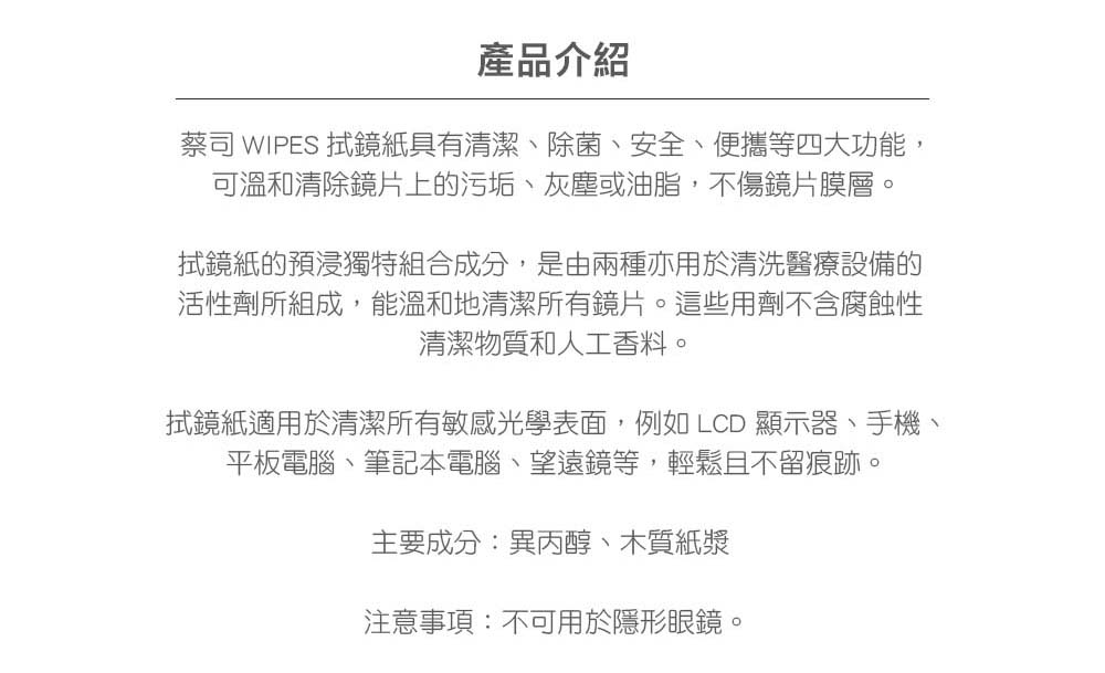 拭鏡紙的預浸獨特組合成分,是由兩種亦用於清洗醫療設備的活性劑所組成,能溫和地清潔所有鏡片。這些用劑不含腐蝕性清潔物質和人工香料。蔡司鏡片清潔專業光學拭鏡紙也可用於清潔所有類型的敏感光學表面(例如LCD 顯示器、手機、平板電腦、筆記本電腦、行動電話等),輕鬆且不留痕跡。