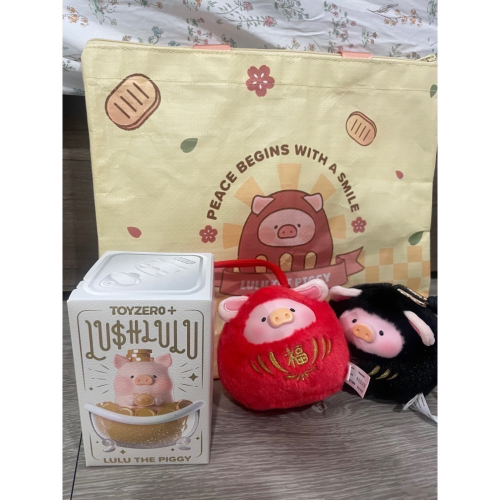 內容含:袋子、黑達摩(有卡無盒)、紅達摩(有卡無盒)、全新未拆浴豬滿盆公仔