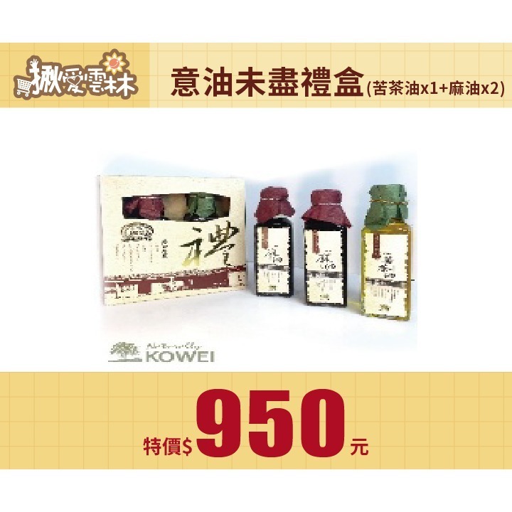 【品名】意油未盡禮盒(苦茶油1入、麻油2入組)