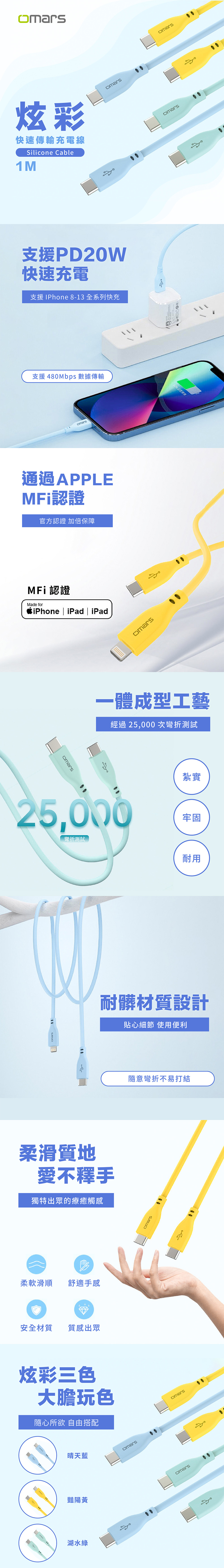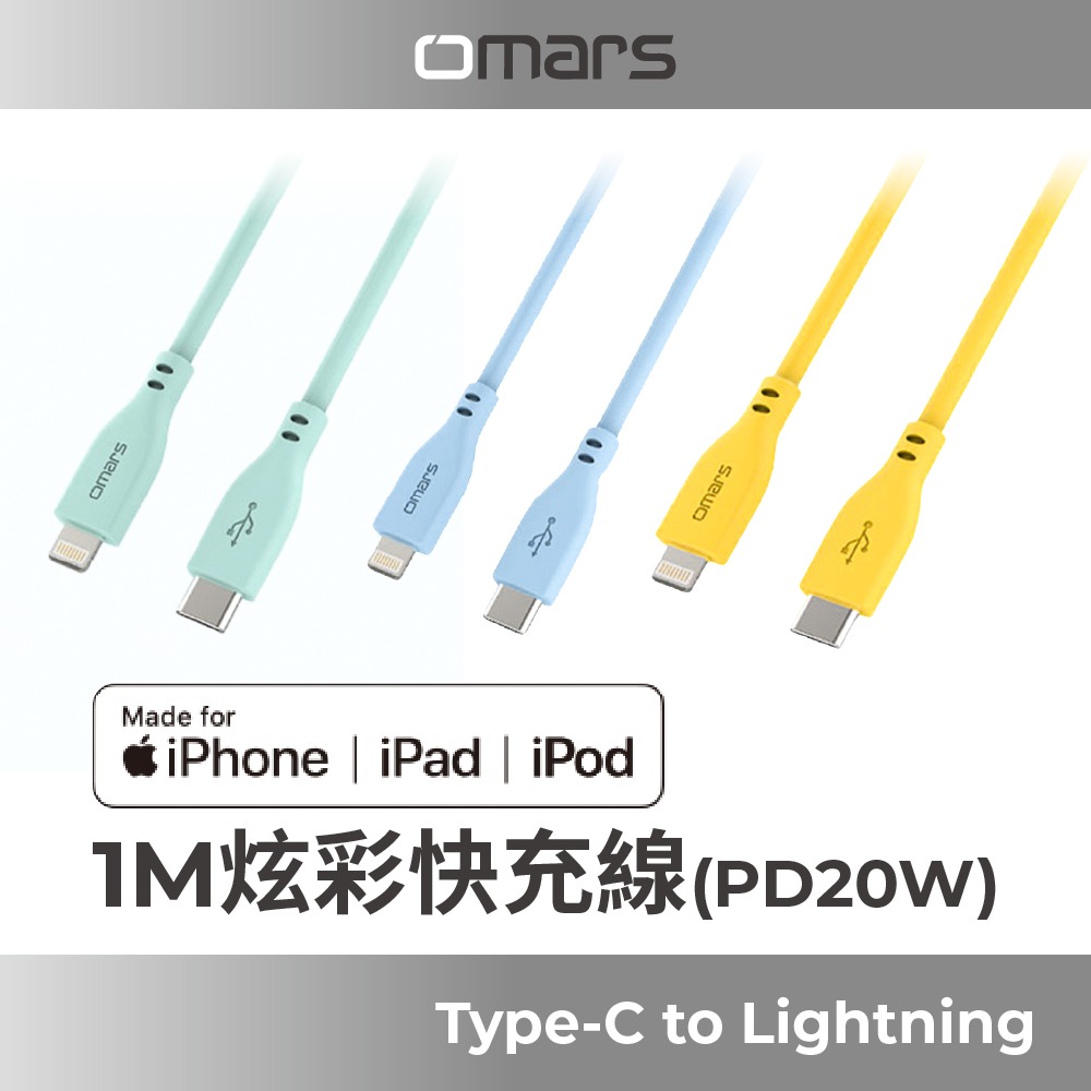 品名:【omars】USB-C to Lightning 炫彩快速傳輸充電線1m (PD20w)