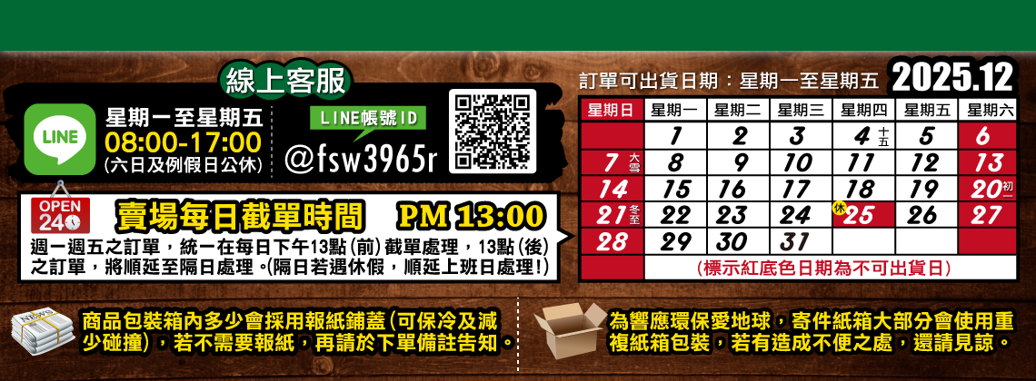 <p><span style="background-color:rgb(41,82,24)&#59;"><font color="#ffffff"> 2025年12月份  行事曆公告 </font></span><br />[12月]行憲紀念日(聖誕節):12/25(休息一日)<br /><span style="color:rgb(255,255,255)&#59;background-color:rgb(41,82,24)&#59;"> (六日及國定假日公休,無提供出貨服務) </span></p>