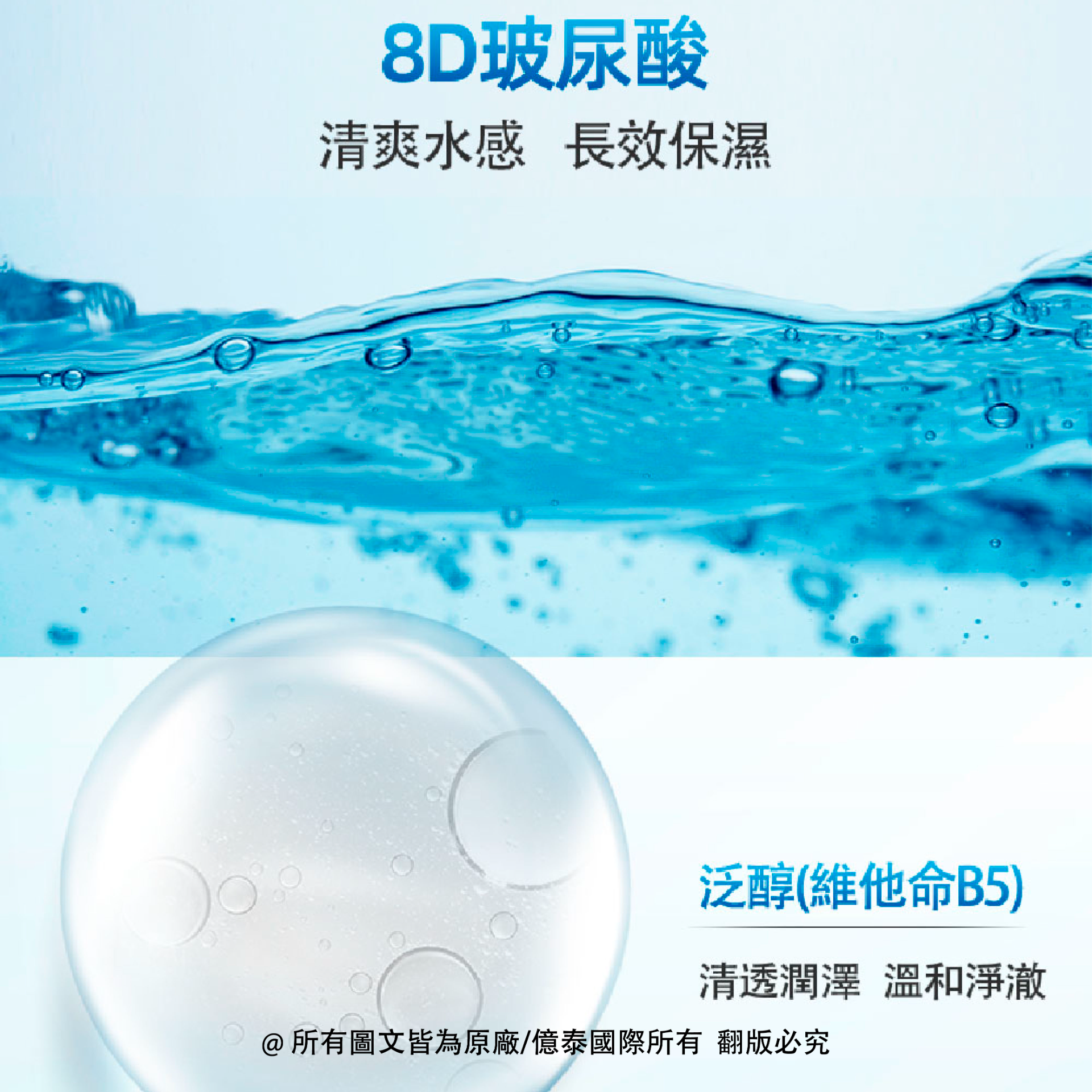 💧 8D玻尿酸黑科技 結合8種不同分子量玻尿酸,形成3D保濕網絡,深層補水同步鎖水