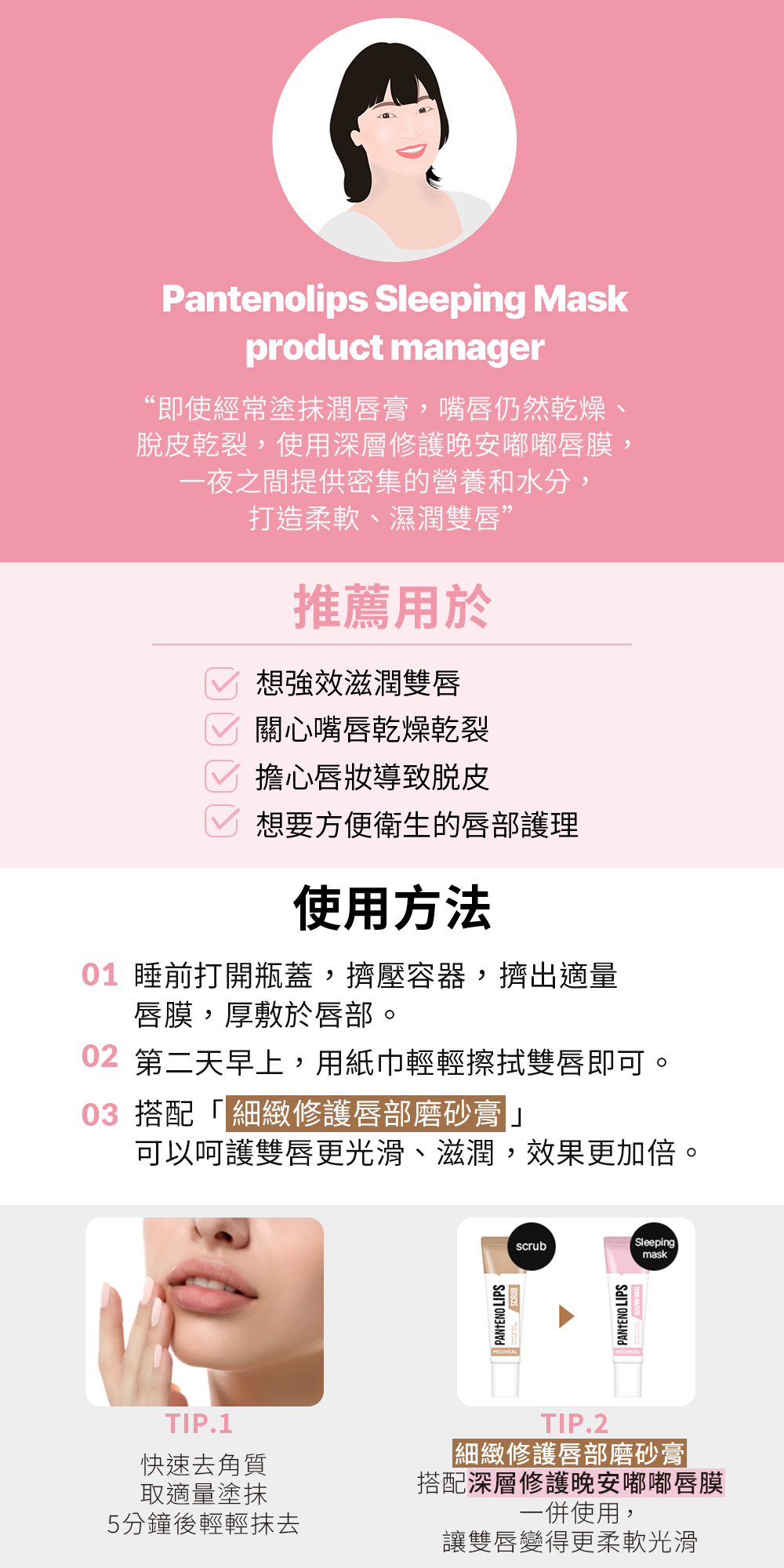 3. 搭配「深層修護晚安嘟嘟唇磨」,效果更加倍 *使用磨砂粒時請小心,避免進入口中