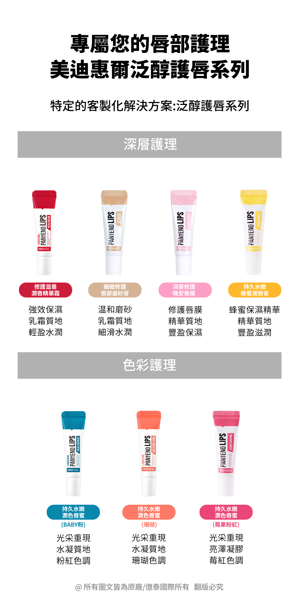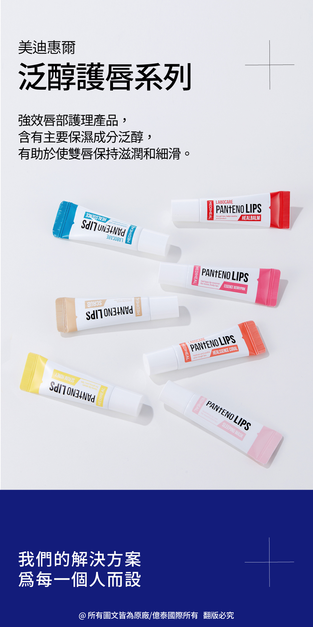 專利修護成分: 富含維生素原B5(Panthenol),能深層保濕並修護乾燥受損的唇部肌膚,有效改善脫皮、乾裂問題。