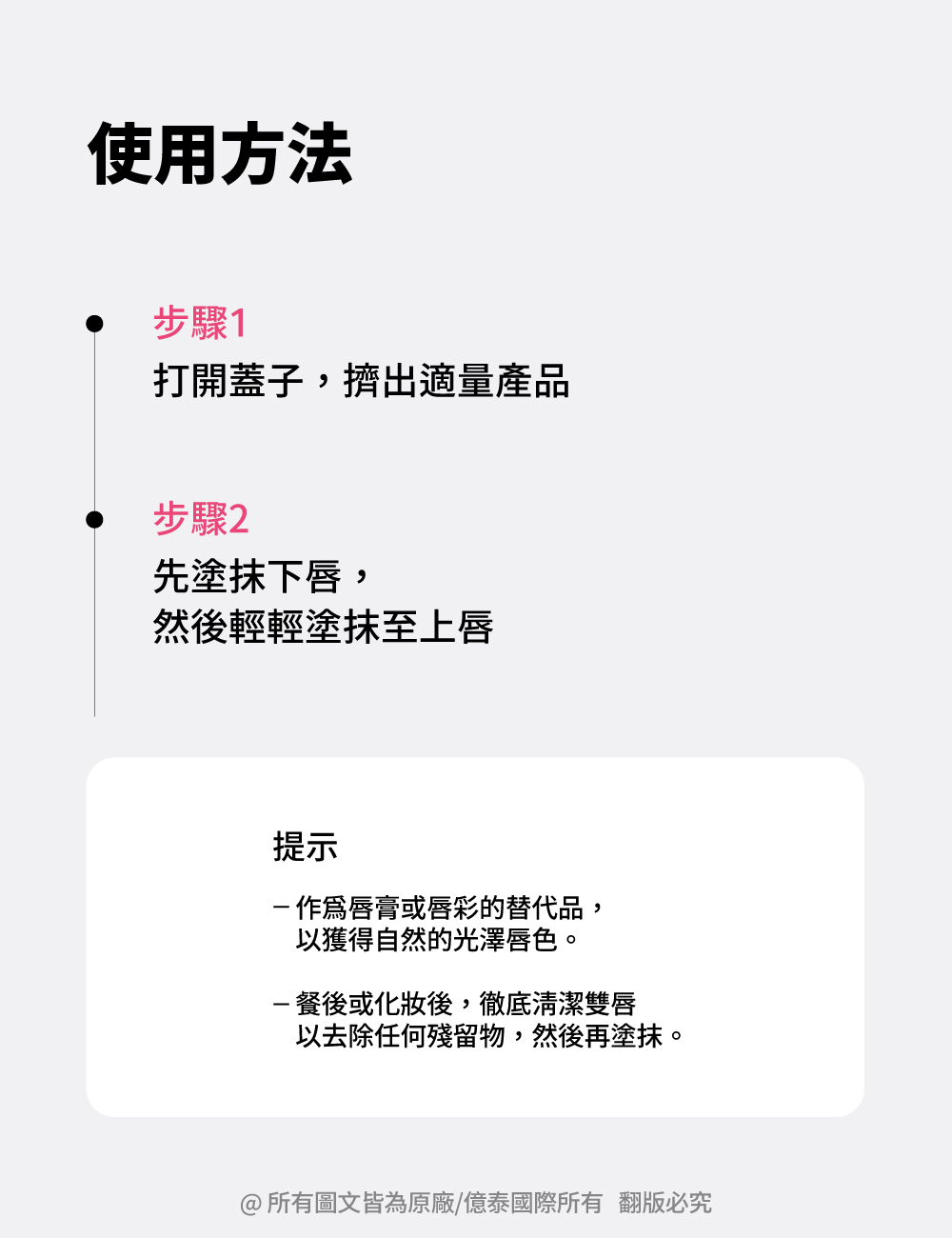 日常滋潤: 隨時隨地輕抹,保持雙唇水潤,告別乾燥。