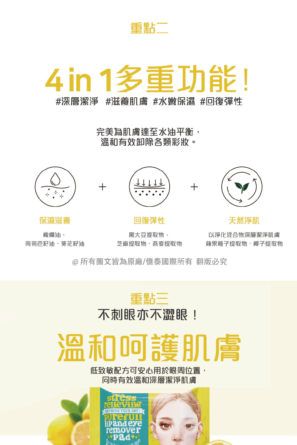 🌿 一片搞定,輕鬆卸妝不殘留! 艾藜兒 淨膚雙面眼唇卸妝棉 (30片),是您的日常卸妝神隊友。 添加 Purefull Cocktail 蔬果植萃與天然精油,溫和卸除防水眼妝與唇妝,同時保濕滋養不乾澀。 雙面設計:壓紋面溶妝、平滑面舒緩擦拭,搭配 pH5.7 弱酸性配方,敏感肌也能安心使用。 便攜包裝,出差旅行必備,輕鬆卸妝零殘留!💧👜