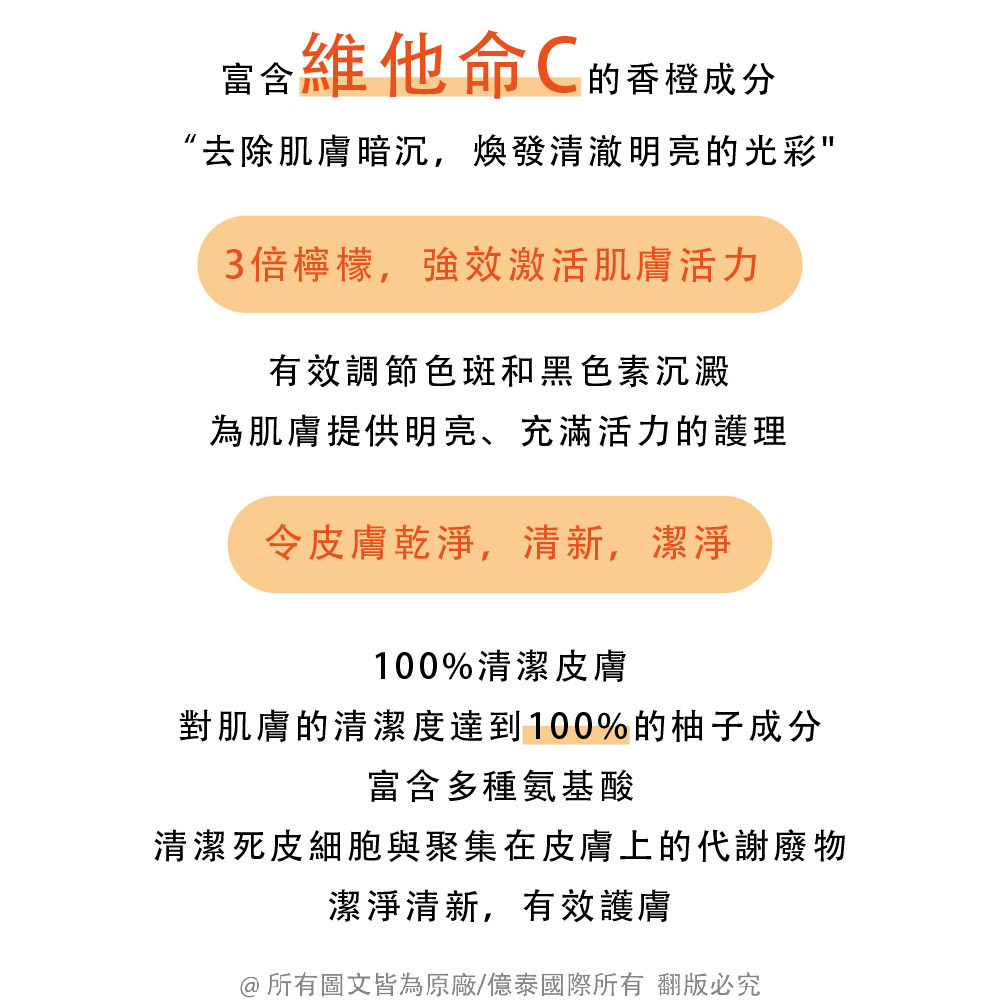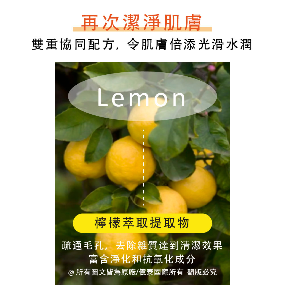 維他命C與檸檬精華相輔相成,有效提亮膚色、改善暗沉,使肌膚展現清透淨膚光澤。