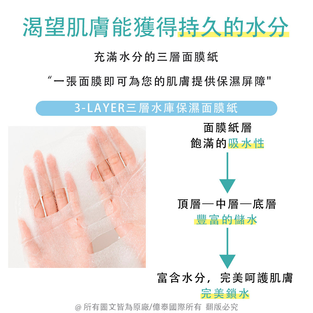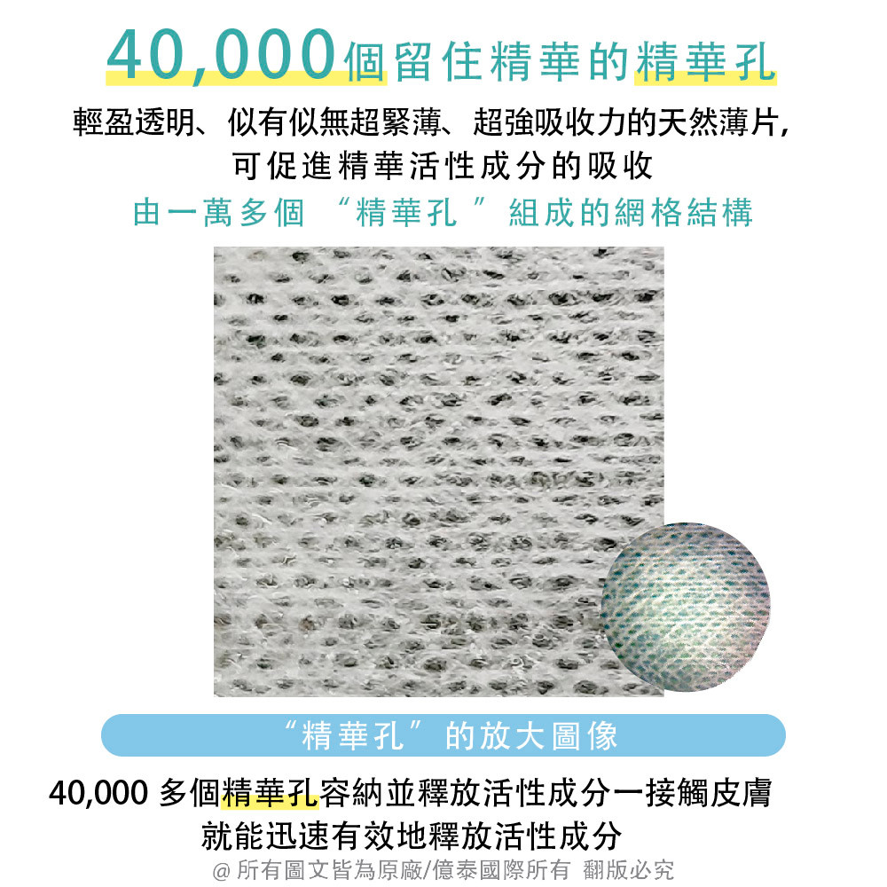 細緻纖維緊密貼膚,讓精華充分吸收至每一寸肌膚,維持長效保濕與水潤亮澤。