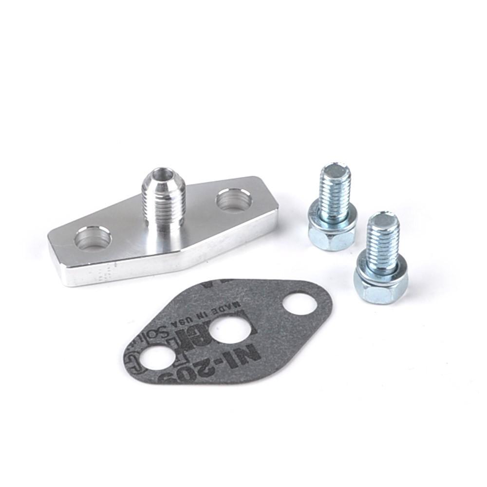 Application: Garrett T3, T4, TB03, T04B, T04E, T60, T61 ( Journal Bearing Turbo) Kit incl: - 1 x 38.1 mm flange with 2mm restrictor (0.08" hole to prevent oil overflow that makes smoke.) - 1 x gasket - 2 x 8mm bolts Material: Aluminum 6061