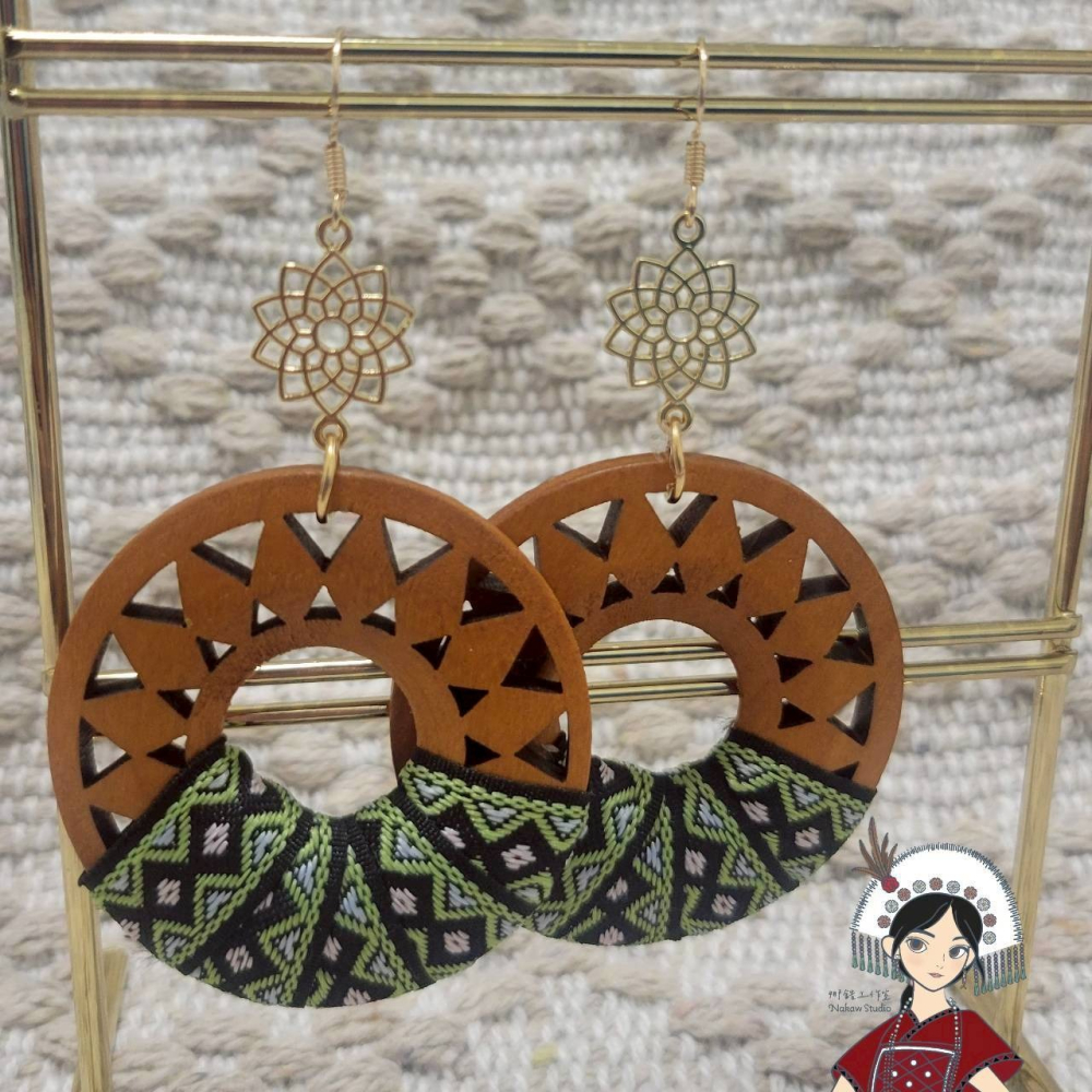 【nakaw.studio】民族風耳環 木質鏤空圓環 綠黑圖騰織帶拼接 花朵吊飾手作耳飾
