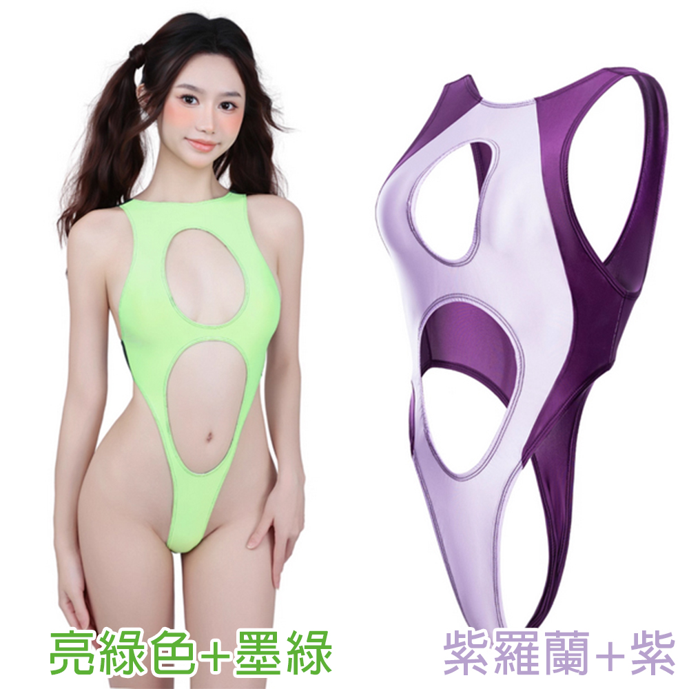 商品名稱:鏤空挖空拼色無袖背心露背高叉丁字襠錦氨油亮連身泳衣泳裝